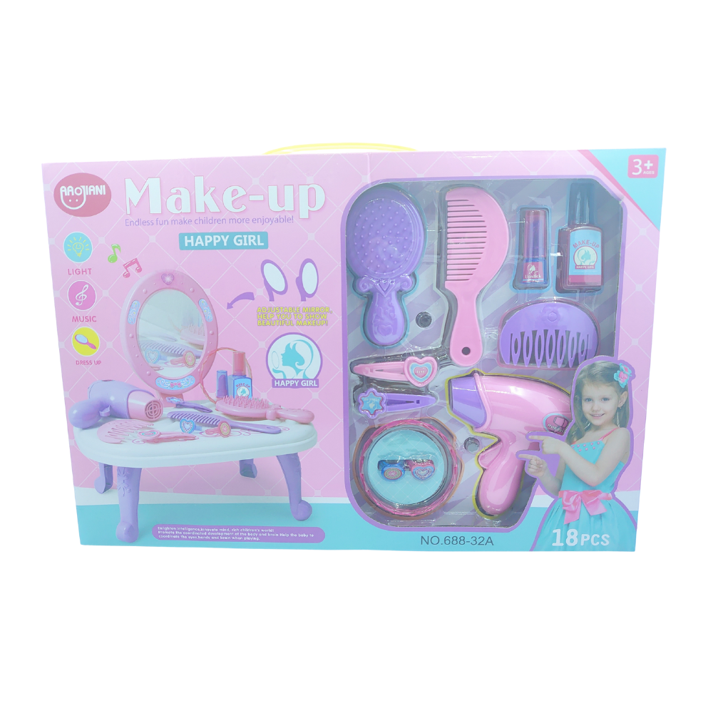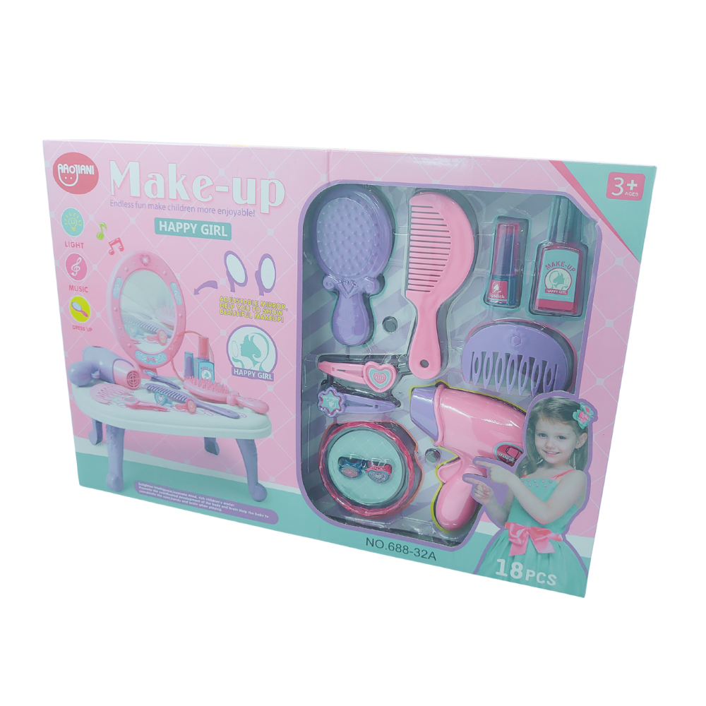 Let your little one enjoy endless fun and creativity with the Happy Girl Makeup Vanity Playset! Designed for kids aged 3 years and above, this 18-piece beauty set includes a variety of pretend makeup accessories such as a hairdryer, combs, mirror, brush, and more. The mirror features light and music effects for an engaging playtime experience. Perfect for role play, this makeup set helps enhance imagination, confidence, and fine motor skills while keeping your child entertained for hours.