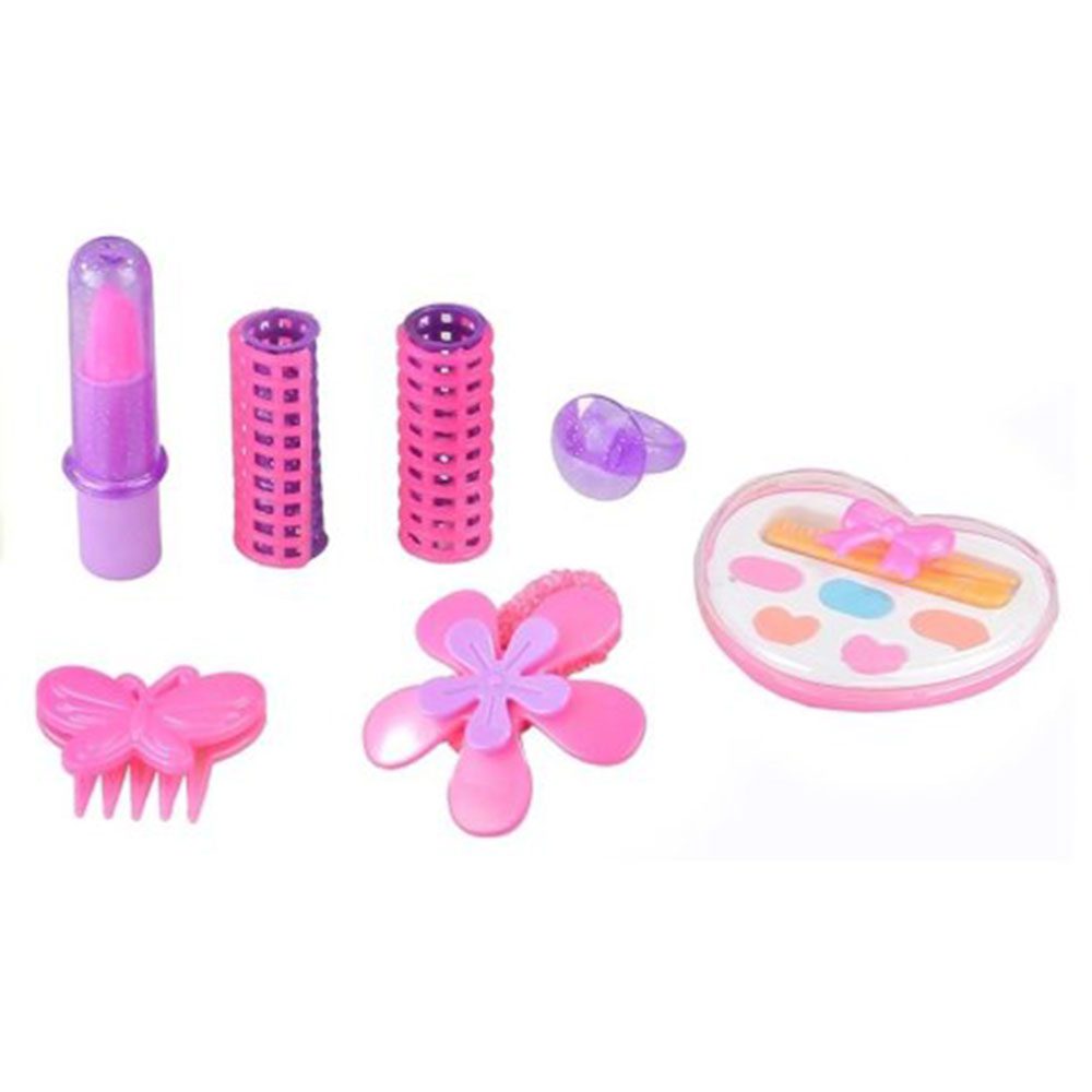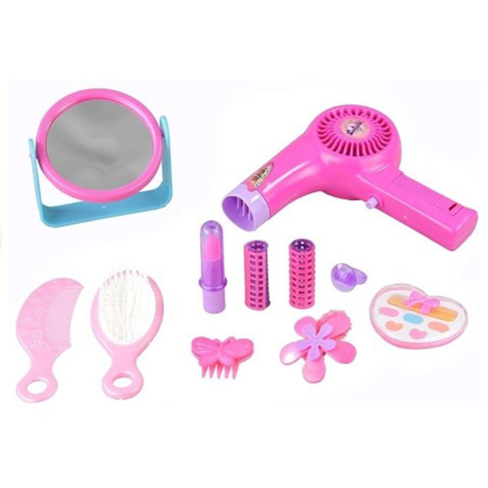 Includes toy hair dryer, mirror, combs, rollers, makeup palette & accessories